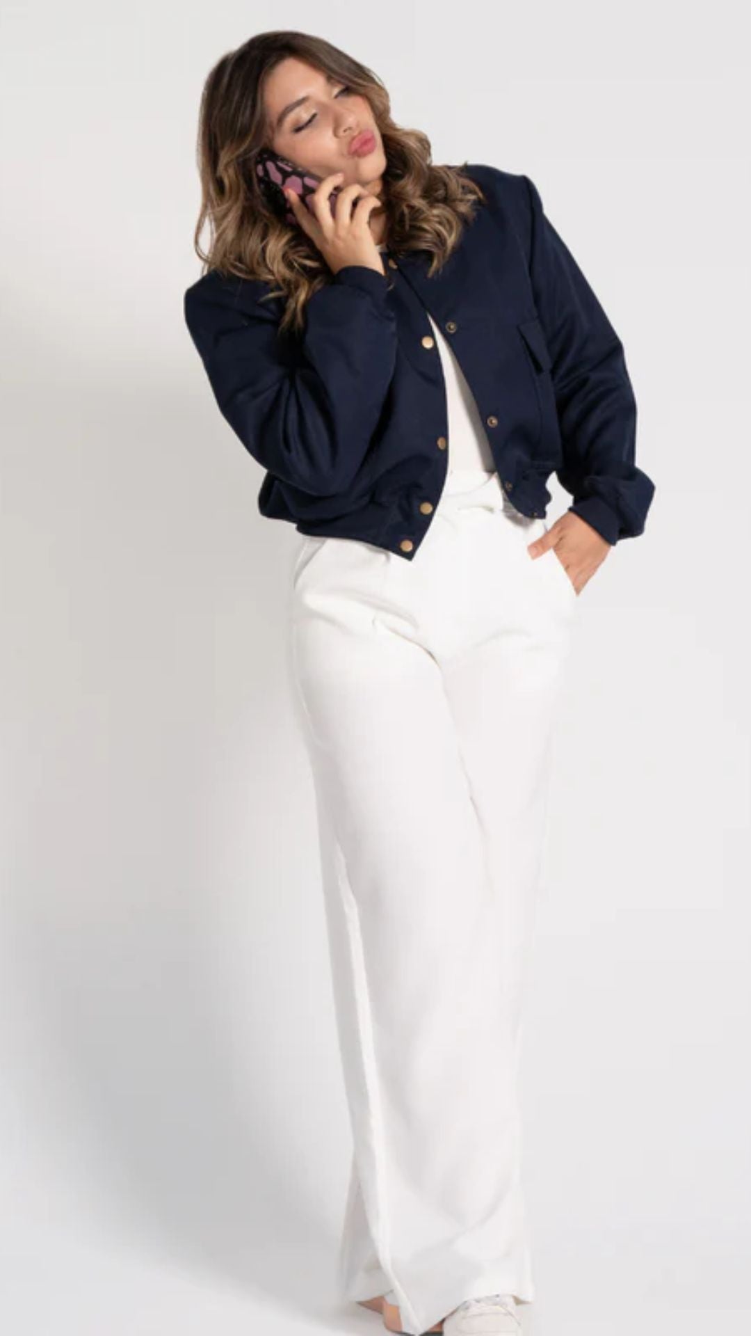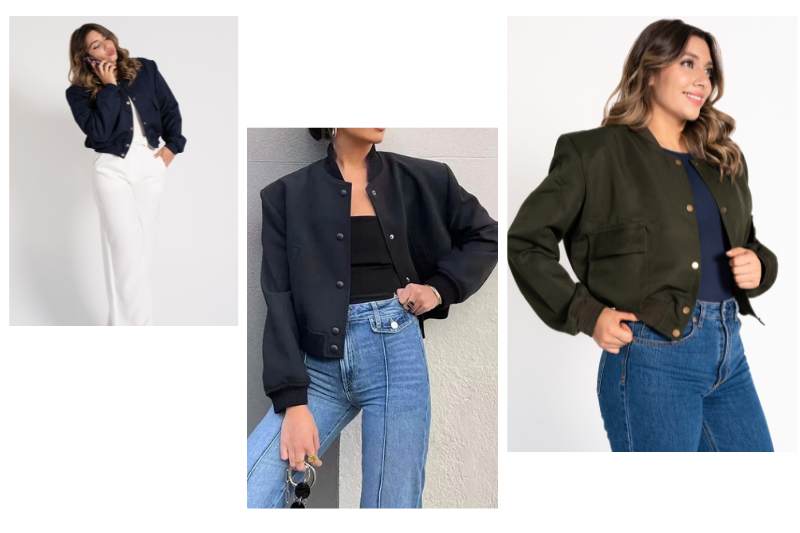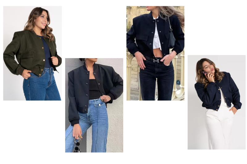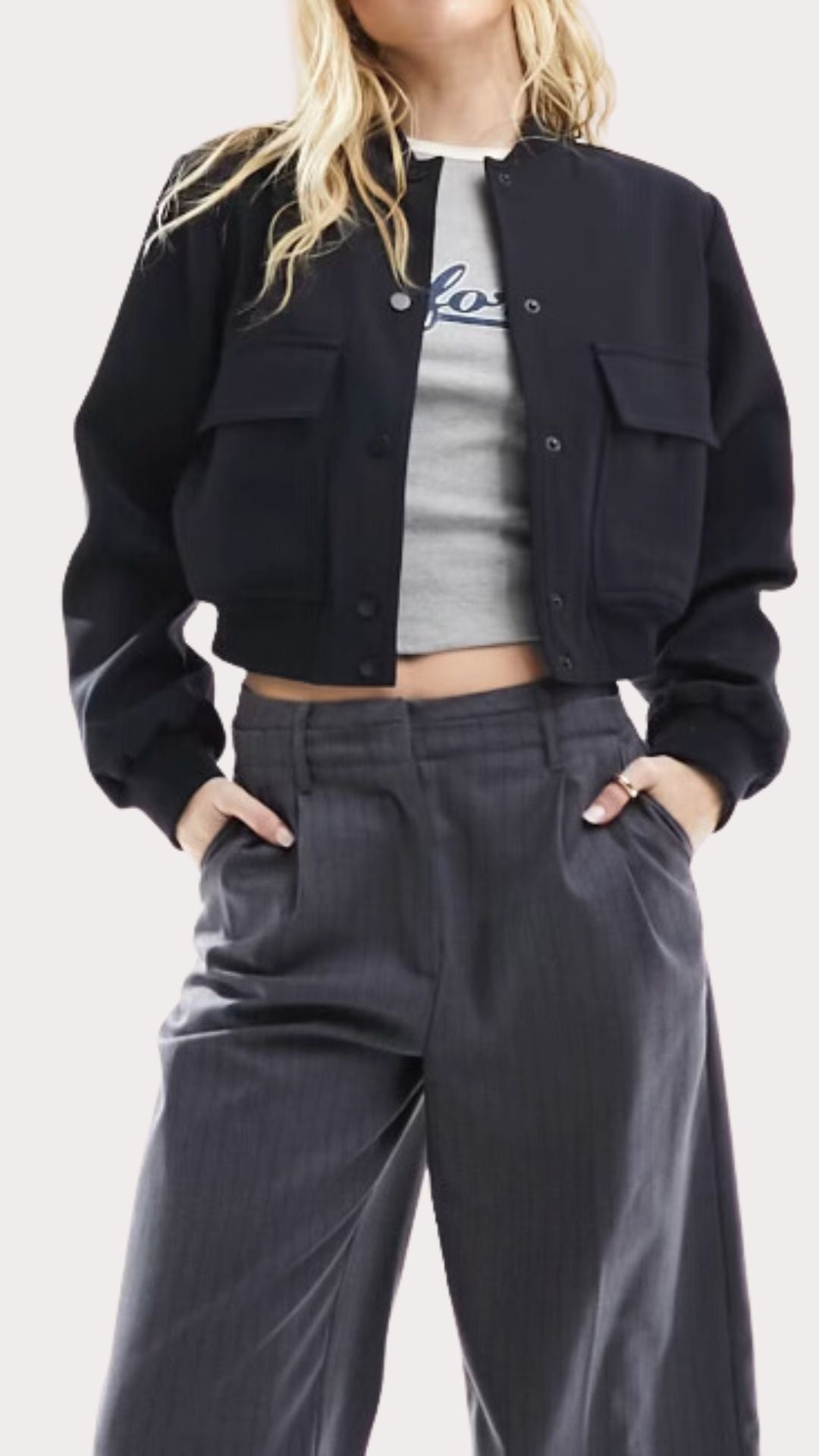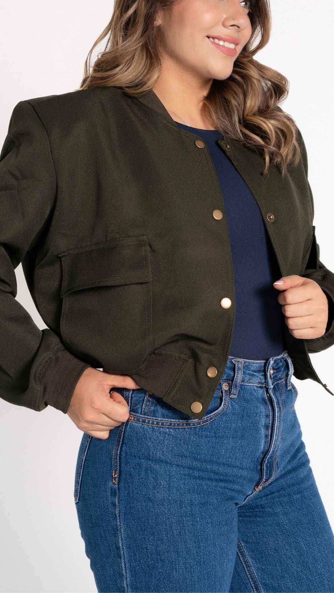 Cazadora bomber corta de cuello redondo y manga larga. Bolsillos delanteros de plastrón con solapa. Detalle de acabados en rib. Cierre frontal con botones a presión. Disponible en varios colores.